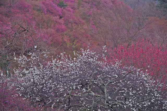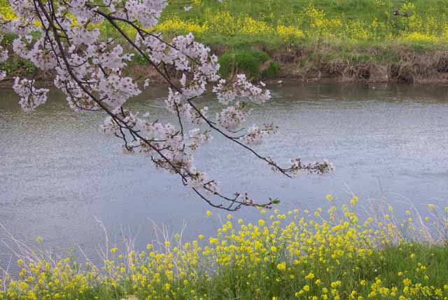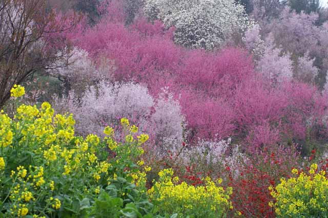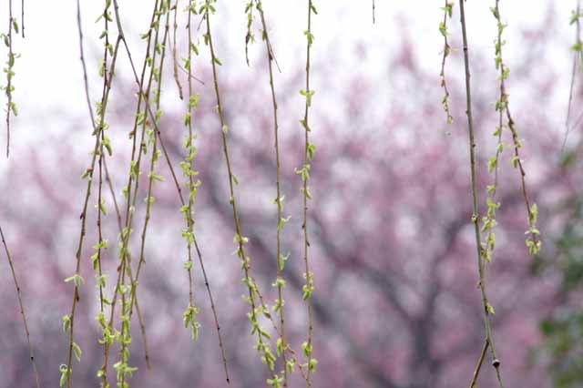 ウメ シダレヤナギ ナノハナとハナモモ